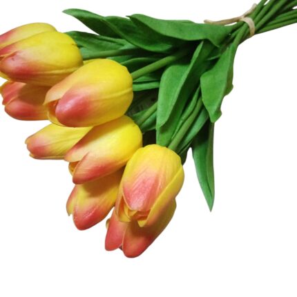Adaugă un plus de eleganță și prospețime decorului tău cu acest buchet de lalele Real Touch, format din 10 fire, cu o înălțime de 33.5 cm. Datorită tehnologiei Real Touch, florile au un aspect și o textură extrem de apropiate de cele naturale, fiind alegerea ideală pentru aranjamente florale premium.