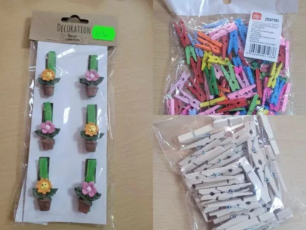 Disponibile în diferite forme, dimensiuni și modele – de la cleme simple până la cleme cu decorațiuni tematice (inimi, fluturi, steluțe, mesaje etc.) – aceste accesorii sunt ușor de utilizat și pot fi atașate pe suporturi florale, panglici, rame, coronițe, ghivece sau buchete. Pot fi folosite ca suporturi pentru etichete, mesaje personalizate, cartonașe cu nume sau elemente decorative suplimentare. Clemele pot fi lăsate în culoarea naturală a lemnului pentru un look rustic sau pot fi vopsite, lăcuite sau decorate în funcție de tematica evenimentului sau a decorului.