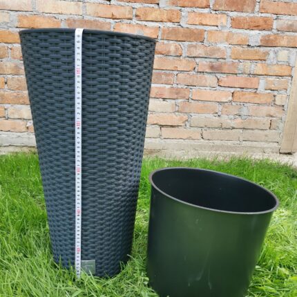 Ghiveci inalt pentru flori cu un design foarte modern si textura care imită o împletitură din ratan naturala. Aceste ghivece in doua dimensiuni vă permit să creati un design exterior unic si să va organizati fără probleme spatiu în jurul casei. Fabricat din plastic de înaltă calitate (polipropilenă), rezistent la conditiile meteorologice (cum ar fi ploaia, zăpada, înghețul) si razele UV, intreținere ușoară, 2 in 1 ( ghiveci cu suport interior).
