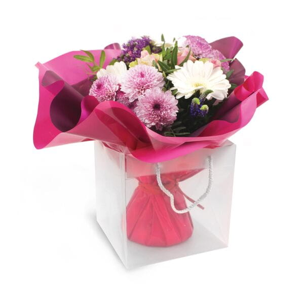 Designul transparent pune în valoare florile și plantele, evidențiind culorile și detaliile aranjamentului. Marginea albă și mânerele din șnur adaugă un plus de rafinament și facilitează transportul în siguranță. Este perfectă pentru florării, magazine de cadouri, evenimente speciale sau pentru ambalarea plantelor oferite în dar.