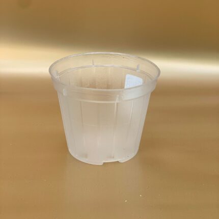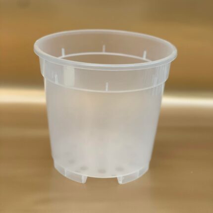 Recipient transparent util in special, pentru orhidee. Materialul acestuia este din plastic.