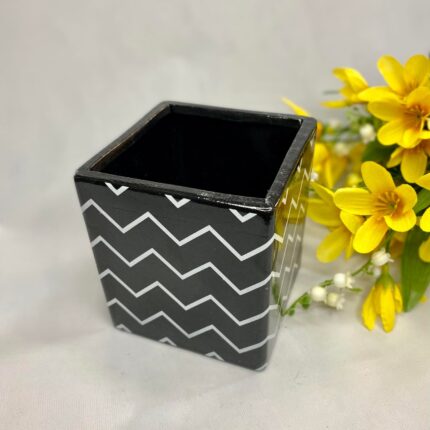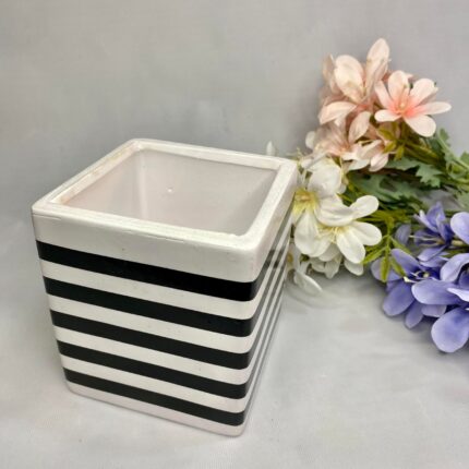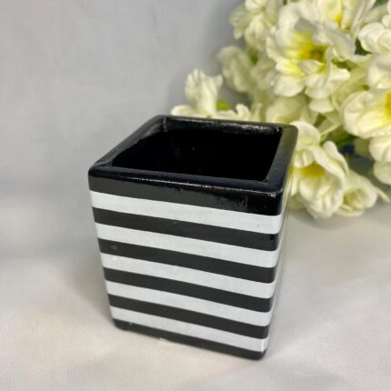 Vase ceramice pătrate, cu model în linii alb și negru.